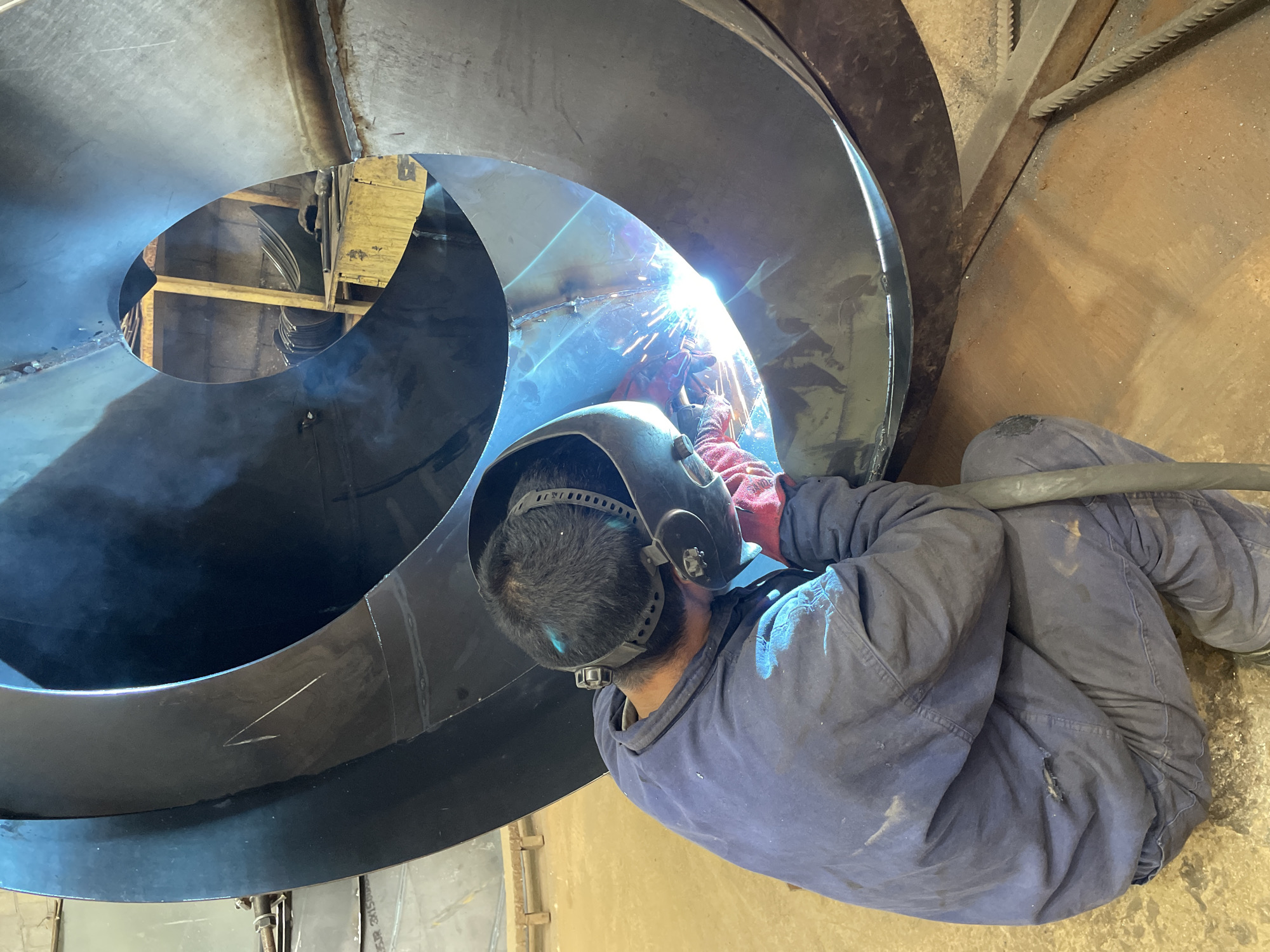 A welder in full protective gear is welding a large, black, spiral metal structure indoors