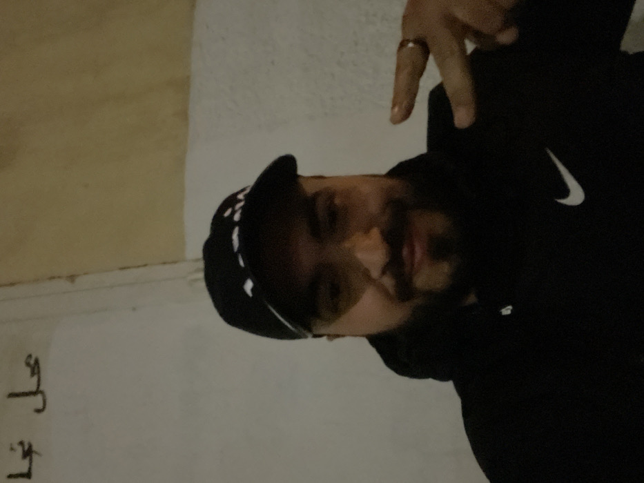 A person wearing a black Nike hoodie and a black baseball cap is turned sideways. The person has a mustache and a beard. They are flashing the peace sign with their right hand. There are Arabic characters on the wall behind the person. The wall appears to be pale gray in color.