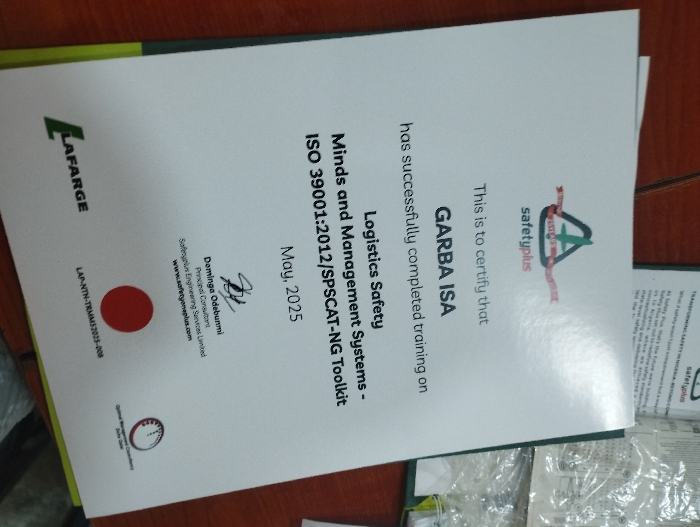 The image is a certificate for a training course on Logistics Safety Management Systems, specifically the ISO 39001:2012/SPSCAT-NG Toolkit. The certificate is issued to GARBA ISA, who has successfully completed the training on an unspecified date. The certificate is issued by Lafarge, a global building materials company, and is dated May 2025. The signature of Damilola Odubunmi, who is presumably a representative of Lafarge, is also present on the certificate. The image appears to have been taken in Ashaka, Nigeria, which is located at the coordinates 10.929, 11.476. The certificate is lying on a wooden table, with other papers visible in the background.