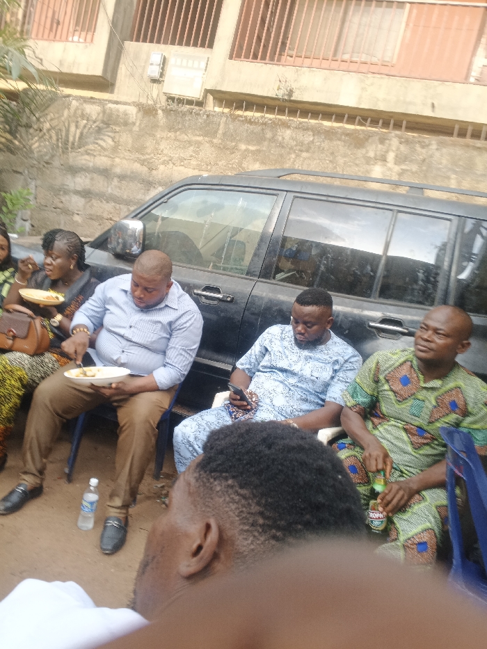 Four adults sit outside next to a black SUV, eating. One man in a blue and white patterned shirt looks at his phone. Another man in a green and brown patterned shirt holds a bottle. A woman in a dark dress eats from a plate. A man in a light blue dress shirt and khakis eats from a white plate. A water bottle sits near his feet. The top of another person's head and shoulder is partially visible in the foreground. A building is in the background.
