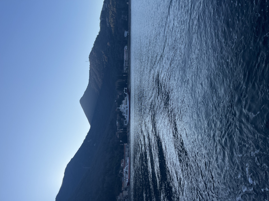 The image depicts a panoramic view of the Bay of Kotor, specifically looking towards the coastal area of Lepetane, Montenegro, from the water. In the foreground, dark blue water exhibits distinct ripples and subtle wave patterns, indicating movement. The midground features the shoreline of Lepetane, where two large car ferries are docked or moored. The ferry on the left has a red hull with a white superstructure, positioned closer to a cluster of low-rise buildings with red-tiled roofs. The ferry on the right is larger, predominantly white with a red stripe along its hull, and appears stationary. Both ferries are parallel to the shore. Behind the ferries and buildings, the land rises steeply into a series of dark green, densely vegetated mountains that dominate the background. The sun, positioned out of frame to the left, casts a distinct shadow diagonally across the face of the prominent, triangular-peaked mountain on the right, illuminating its upper right slope and partially illuminating the mountain on the far left. A small antenna or mast is visible on a ridge to the right of the triangular peak. The sky above is clear and light blue, gradually darkening towards the top of the frame. No individuals are visible in the scene.