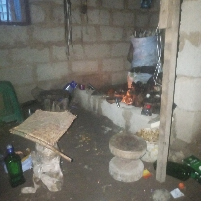The scene depicts the interior of a utilitarian room, likely a kitchen or storage area, located in Iddo Tudunwada, Nigeria. The walls are constructed from exposed, unplastered concrete blocks, and the floor is a dark, unpolished surface. A window with a blue tint is visible on the upper left wall. In the background, a low, built-in concrete counter or platform extends along the right wall. On this platform, there is evidence of an active cooking fire or glowing embers, surrounded by various dark, irregular objects and potential cooking implements. Behind the counter, a large white sack filled with numerous slender, dark objects, consistent with firewood or kindling, leans against the wall. White electrical wiring descends from the ceiling along the right wall. In the mid-ground, a woven mat, resembling a traditional hand fan, rests atop a light-colored wooden log or stump. On the floor to the right, two round, flat wooden chopping blocks are stacked vertically. Adjacent to these, a white plastic bucket contains a light-colored granular or particulate substance. Various items are scattered across the dark floor: * On the far left, a green plastic chair is visible. * Near the foreground, a green glass bottle with a blue cap and plastic debris are present. * In the foreground to the right, another green glass bottle, an orange-colored fruit, and additional debris are observed. No individuals are present in the depicted scene. The lighting is dim, suggesting an interior space with limited illumination.