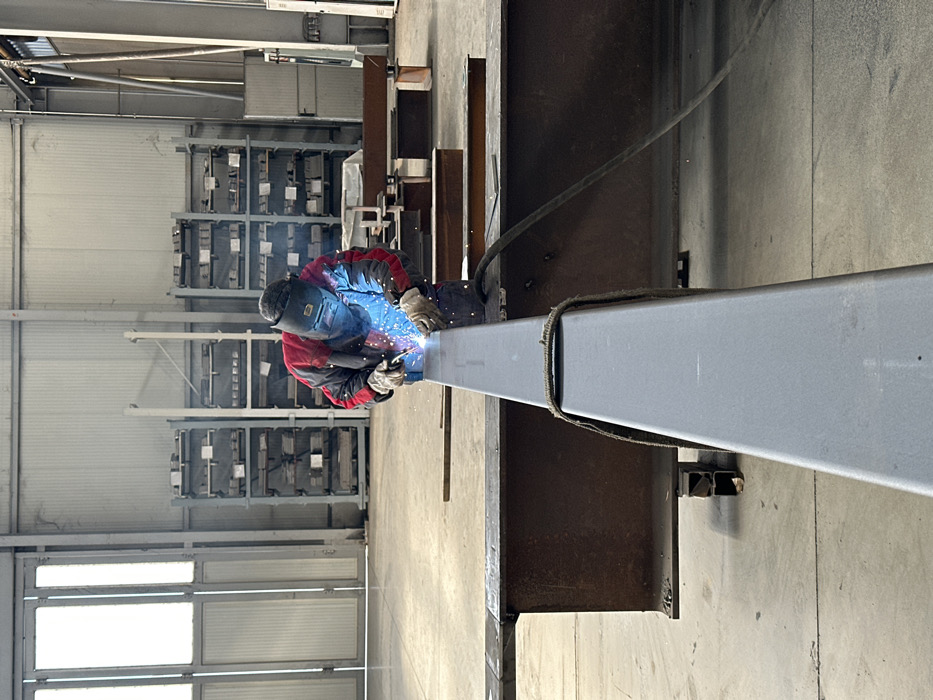 The image displays an industrial welding operation within a large workshop located in Pleven, Bulgaria