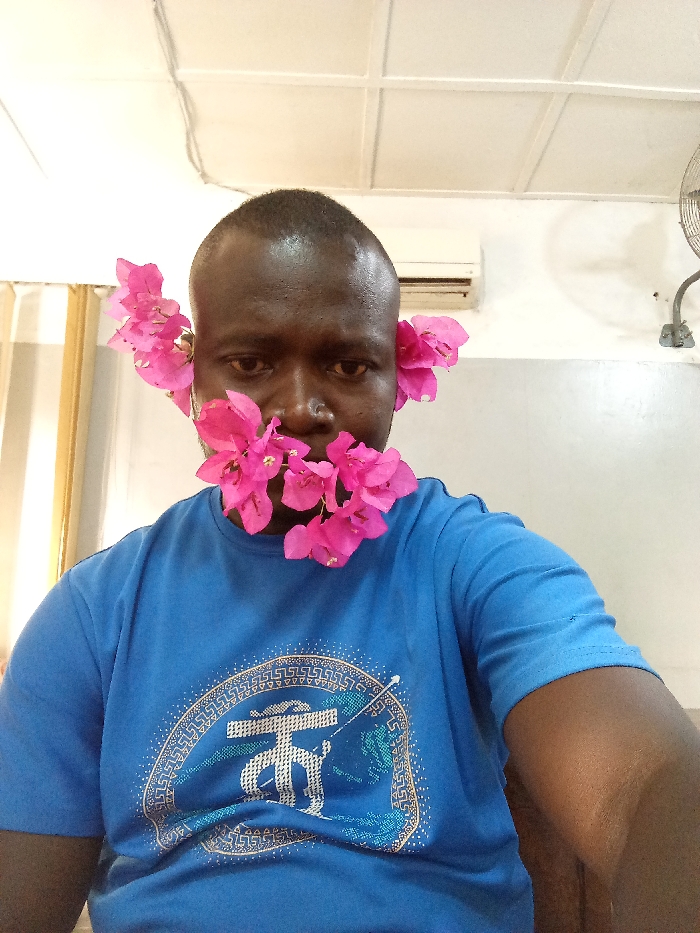 A person with dark skin is positioned centrally, adorned with bright pink flowers near their ears and over their mouth, giving the impression of a floral beard. The person is wearing a blue t-shirt with a circular design featuring geometric patterns and stylized symbols. The background features a cream-colored wall, a white air conditioning unit, and a vintage-style fan. The lighting in the room is bright.