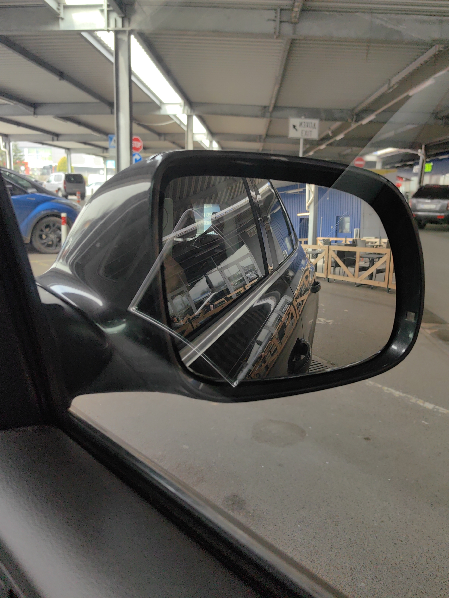 The image depicts a side view mirror of a dark-colored car. The mirror is cracked in the upper left corner. The reflection in the mirror shows the rear of a similar dark-colored car, and a building with blue exterior walls and a fenced outdoor seating area with tables and chairs. Outside of the mirror's view are other parked vehicles, including a blue car, and signs. The location is indicated by the image metadata as Voluyak, Bulgaria. The photograph is taken from inside a vehicle.