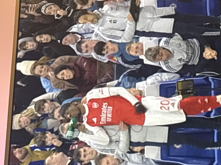 A crowd of people in varying clothing fills the scene. An Arsenal jersey with "Emirates Fly Better" on it and the number 20 is prominent in the foreground, held by a dark-haired individual with a black head covering. Many are wearing white jackets with Adidas stripes. Some have headwear, including a white beanie. The crowd appears to be spectators at an event. The background is a mix of blues and whites, possibly indicating seating and outerwear.