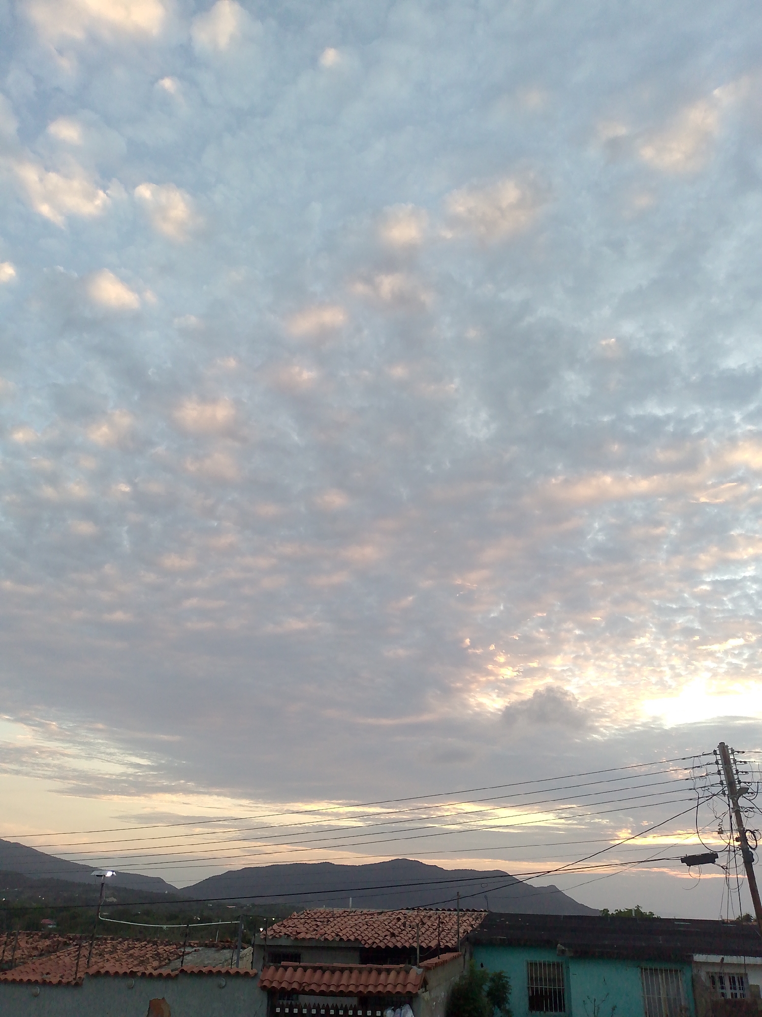 view of Juan Griego, Venezuela at dawn or dusk. The sky is filled with altocumulus clouds, tinged with pink and yellow light. In the background are distant, low-lying mountains. In the foreground, there are rooftops with terracotta tiles and power lines stretching across the scene. A utility pole is visible on the right side of the image. A glimpse of houses with weathered paint can be seen.