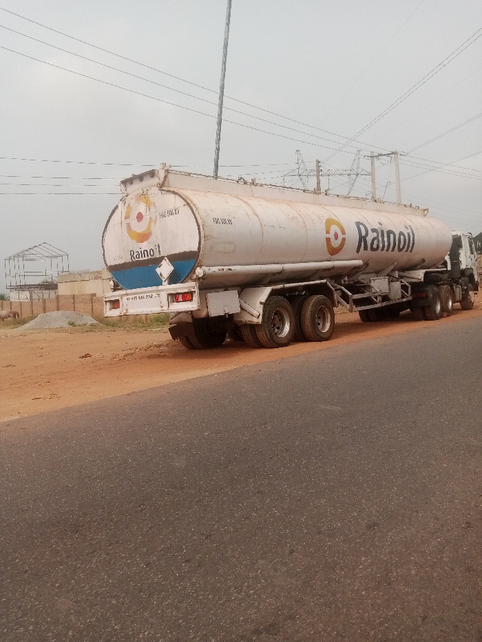In Alade, Nigeria, a white Rainoil tanker truck is parked on the reddish-brown dirt shoulder adjacent to a grey asphalt road