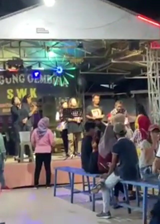 At night, a band plays on a stage under a corrugated metal roof. Behind them, a sign reads “KAMPUNG GEMBIRA SWK.” A blue and green laser light is shining above the stage. About fifteen people, mostly seated, are watching the performance. Some are sitting on long blue benches. One person is holding what appears to be a framed photo on the stage. Some members of the crowd clap along to the music. Most of the people on the stage are playing instruments or singing.
