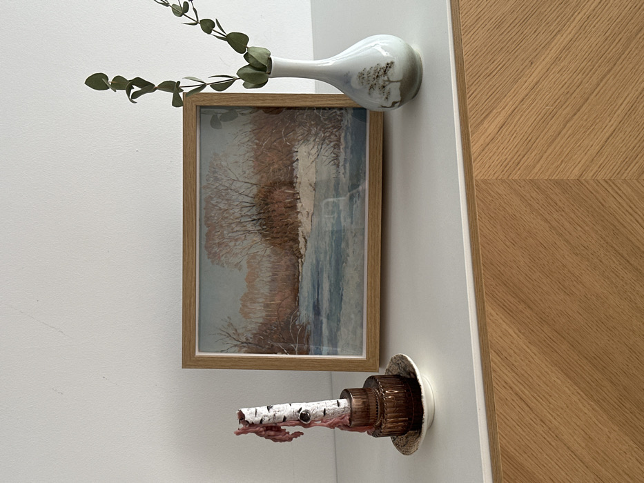 The scene is an interior still life, depicting objects arranged on a white horizontal surface, consistent with a domestic or office setting. This surface rests on a light-colored wooden cabinet featuring a diagonal grain pattern and a thin white trim. A plain white wall forms the background, exhibiting faint scuff marks in its upper left quadrant. From left to right on the white surface: 1. A decorative candle, shaped like a white birch branch with dark markings, displays a solidified pinkish-red wax drip along one side. It is seated in a dark amber, fluted glass holder, which in turn rests on a small, round, off-white saucer with a subtle relief pattern. 2. Centrally positioned is a horizontal landscape print or painting, encased in a light brown wooden frame. The artwork depicts a winter scene featuring a light blue body of water, snow-covered banks, and numerous bare trees with reddish-brown foliage under a pale sky. 3. On the right, a small, white, pear-shaped ceramic vase with a narrow neck holds several sprigs of eucalyptus with round green leaves. The vase's lower bulbous portion is decorated with a painted single tree and a small deer silhouette. No individuals are present. No active actions or interactions are observed.