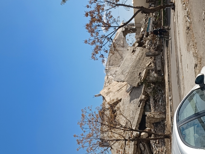 The image depicts an urban street scene in Al-Qadam Municipality, Syria, under a clear blue sky. In the mid-ground, a massive pile of concrete and debris from a collapsed multi-story building occupies the space behind a paved asphalt road and an adjacent concrete sidewalk. Portions of walls and reinforced concrete slabs are visible within the rubble, with a large arched opening discernible on the right side of the demolition site. Two sparse, deciduous trees with brown foliage stand, one on the left and one on the right, partially framing the collapsed structure. On the asphalt road, a solitary individual is observed riding a bicycle or small motorcycle from right to left, wearing dark attire. In the immediate lower-left foreground, the front quarter of a light-colored sedan is partially visible.