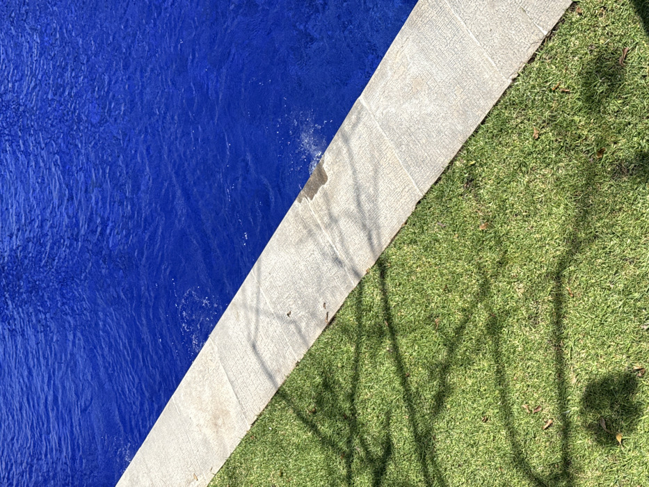 A top-down view shows a pool filled with dark blue water, a stone walkway, and green grass. Tree shadows fall across the grass. The walkway diagonally separates the water from the grass. A small splash is visible on the edge of the pool and walkway.
