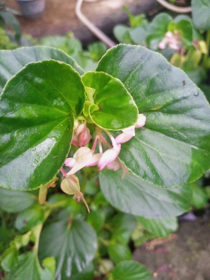 - "This image depicts a close-up view of a plant featuring multiple green leaves and clusters of small, delicate pink and white flowers, consistent with a begonia species, located in a cultivated garden or nursery setting within the city of Bamhori, India" by FM-whvDf1, licensed under CC BY 4.0