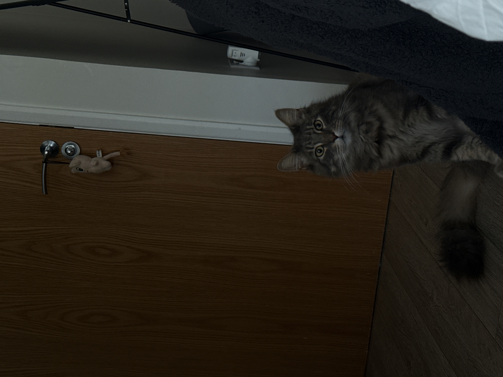 The scene depicts an indoor setting within a dwelling in London, United Kingdom. A long-haired domestic cat, exhibiting grey and brown tabby markings and wide yellow-green eyes, is seated upright on a light-colored wooden floor in the lower-center. To the left, a closed wooden door with a visible grain pattern occupies the background. A metallic lever door handle is affixed to the door, from which a small, light-colored plush toy with a visible tag partially obscured by shadow is suspended. Adjacent to the door on the right is a white door frame or wall segment, featuring a white electrical device mounted upon it. The far right side of the image reveals a dark, textured fabric object, potentially a blanket, positioned next to a white fabric, with a dark metal frame partially visible behind them. The cat faces directly towards the viewer.