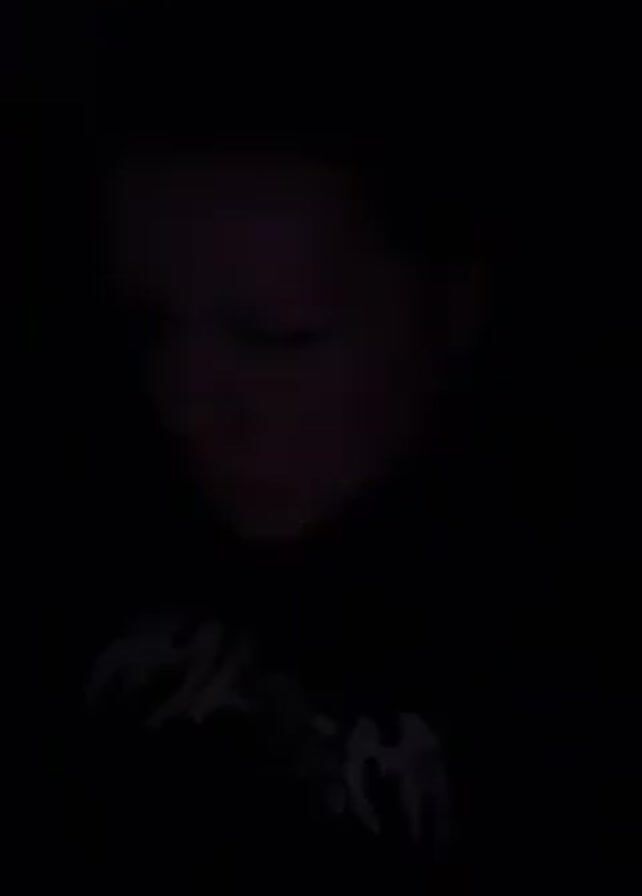 A person with dark hair in a bun, wearing a black hoodie with a white logo, is looking down at the camera. Their eyebrows are painted light blue and they have blue eyeshadow with black eyeliner. The lighting is dim, revealing the person's features when it brightens, then fading back into shadows. They have a lip piercing. The person makes a kissing face.