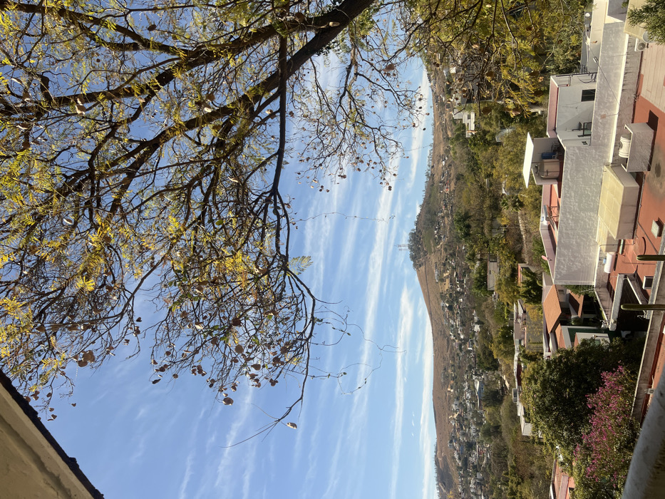 A clear blue sky streaked with thin, elongated clouds dominates the view, framed by the bare branches of a tree with sparse yellow leaves. Below, a hillside is densely populated with houses and vegetation, leading to a ridge at the top. Some buildings with red tile roofs and white walls are visible on a structure's edge. Power lines are visible along the hillside.