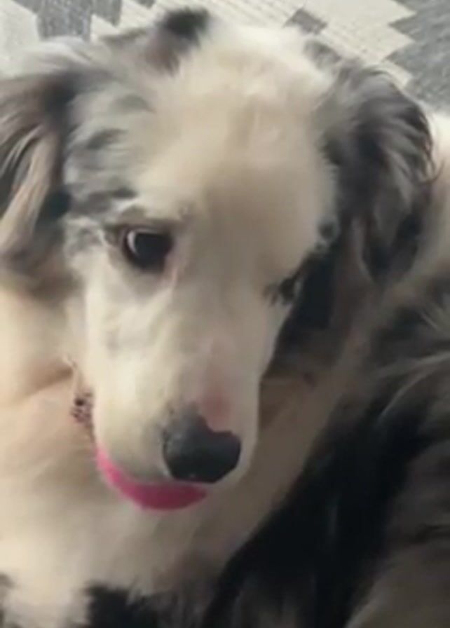 A close-up shot features a dog lying on a gray and white patterned surface, possibly a sofa. The dog has white and gray fur, with dark spots, a black nose shaped like a heart, and its tongue is sticking out slightly and appears to be pink. The dog is looking down with a sleepy expression.