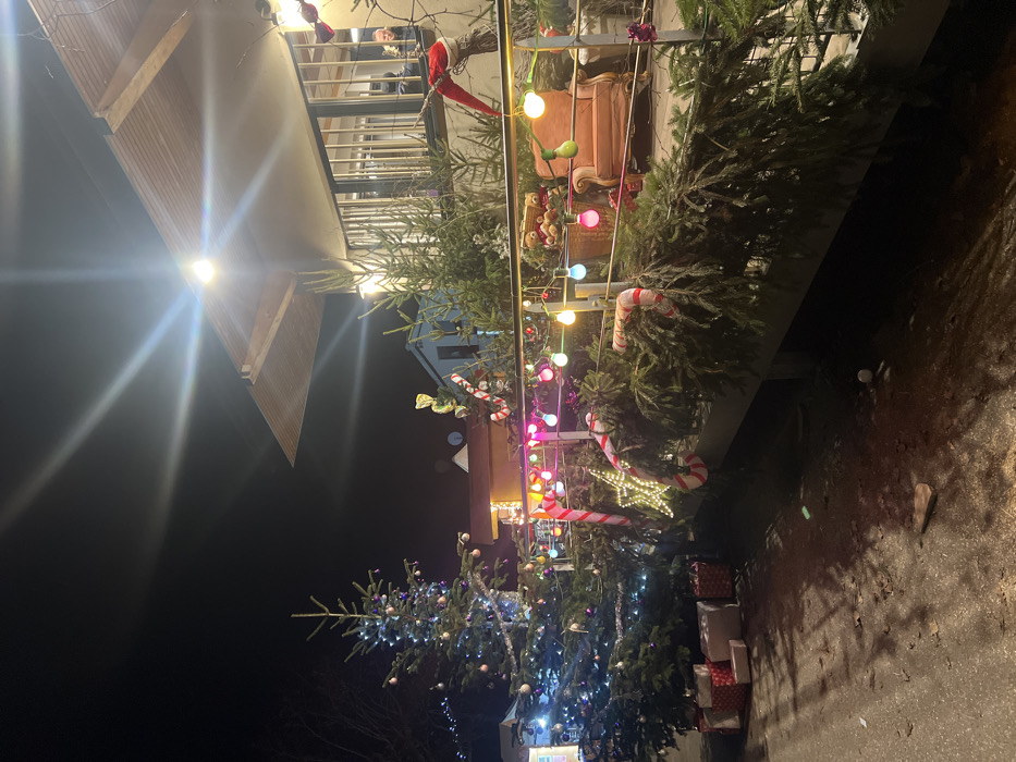 A building exterior is decorated for Christmas. Christmas trees with ornaments and string lights are prominent. A balcony above features a plush chair, a Santa figure, and more decorations. Candy canes and gifts surround the trees. A streetlight shines intensely from above. The overall scene is festive and illuminated against the night sky.