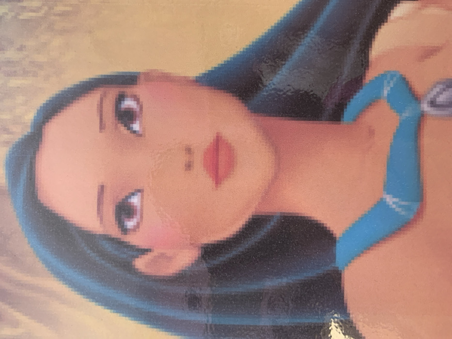 The image displays a head-and-shoulders, frontal portrait of a stylized female figure, characterized by prominent pixelation throughout