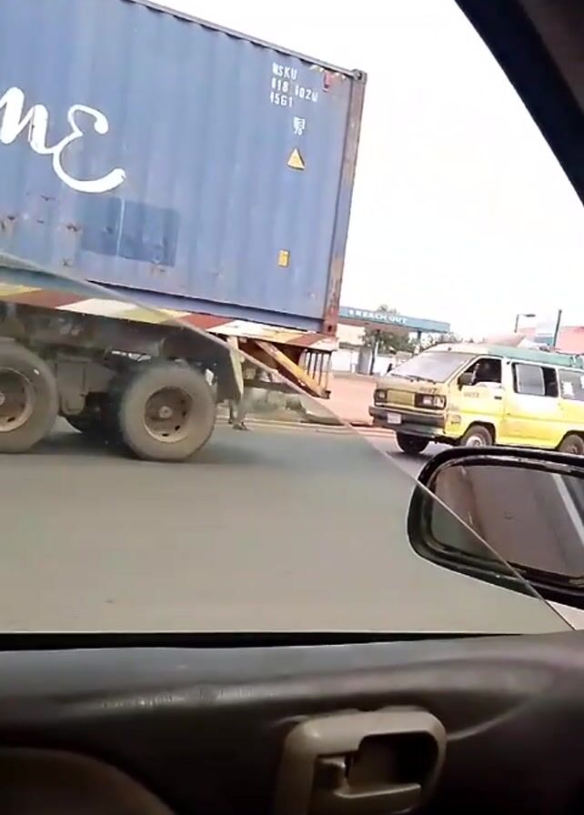 The video, shot from inside a car, shows a yellow van being manually pushed to move. The van is missing its front left tire. The van is being pushed by two men. The van moves and crosses the street. There is a gas station in the background. There is a truck carrying a shipping container parked nearby. Other cars pass.