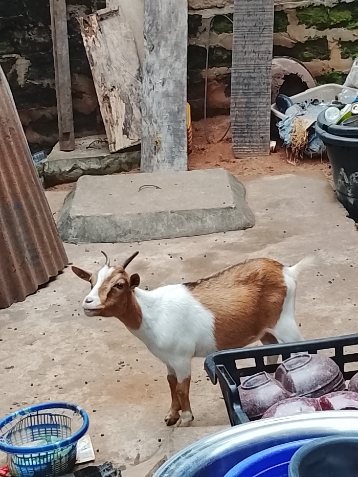 The scene depicts an outdoor, unpaved area in Awada, Nigeria. A medium-sized goat, predominantly brown with a broad white stripe covering its underside and legs, stands in the center-left, facing left with its head slightly turned towards the viewer. It has short, dark horns. The ground is a light-colored, possibly dirt or concrete, surface with numerous small, dark, pellet-like objects scattered across it, consistent with animal droppings. In the immediate foreground, partially obscured, are a blue plastic laundry basket on the left and a black plastic crate filled with reddish-brown bowls on the right. Another blue plastic basin is visible in the bottom right corner. The background consists of a cluttered environment. To the left, a large, vertically oriented piece of rusted corrugated metal sheeting leans against an unseen structure. Behind the goat, several grey concrete blocks or slabs are present on the ground. Further back, vertical wooden or concrete posts are visible, along with sections of a rough, possibly stone or brick, wall. Debris, including what appears to be a large metal rim, fabric, and other miscellaneous items, is accumulated near the back wall on the right side. The overall lighting suggests an overcast day or shaded area. No human figures are present.