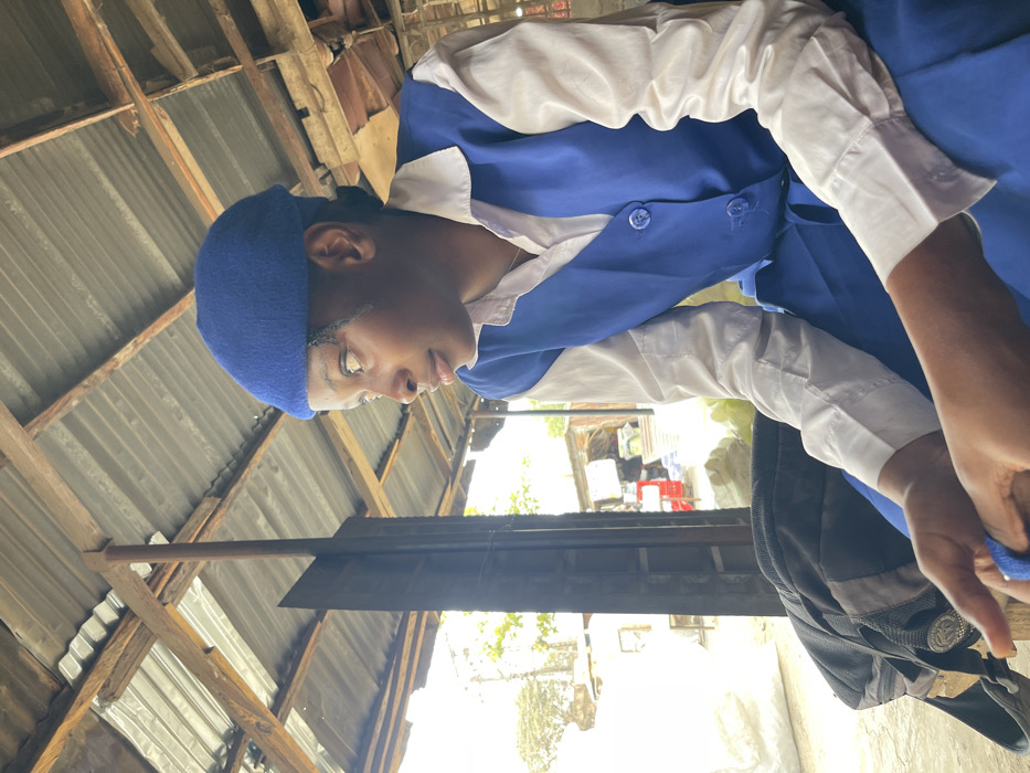 A youthful female is seated under a shaded, open-sided structure in Zaria, Nigeria. She wears a blue beret, a white long-sleeved collared shirt, and a blue sleeveless button-front top, characteristic of a school uniform. Her hands are clasped. She gazes rightward into a brightly lit exterior scene. The overhead structure features a corrugated metal roof supported by wooden beams. A dark backpack rests on a surface to her left. The blurred background reveals an outdoor market or street scene with rudimentary structures, white sacks, and a red object. Daylight illuminates the exterior, contrasting with the shaded interior.