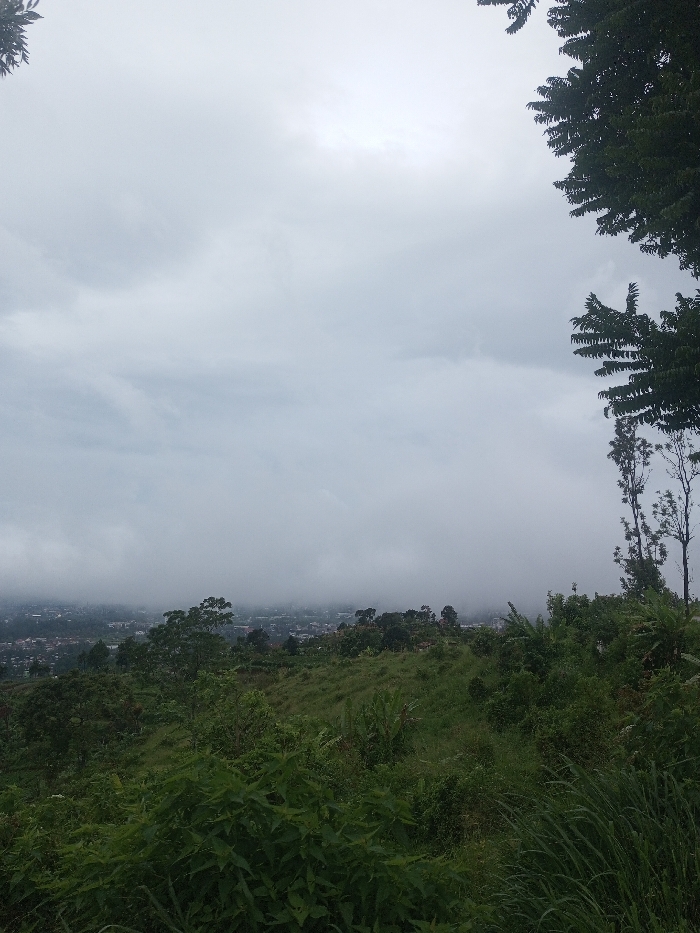 This image presents a panoramic view of Babaliya Mal., India, under an overcast sky. The foreground is occupied by a densely vegetated hillside, featuring a variety of green plants, shrubs, and tall grasses. Foliage from trees partially frames the top-left and top-right corners of the image against the sky. The midground consists of rolling green hills that gradually descend. In the background, an urban settlement is partially visible, characterized by numerous indistinct buildings and structures. This background is heavily obscured by a pervasive layer of dense white-grey fog or low clouds that fills the valley and extends towards the horizon. No individuals, animals, or specific actions are discernible within the captured scene. The overall lighting is diffused, indicating heavy cloud cover.