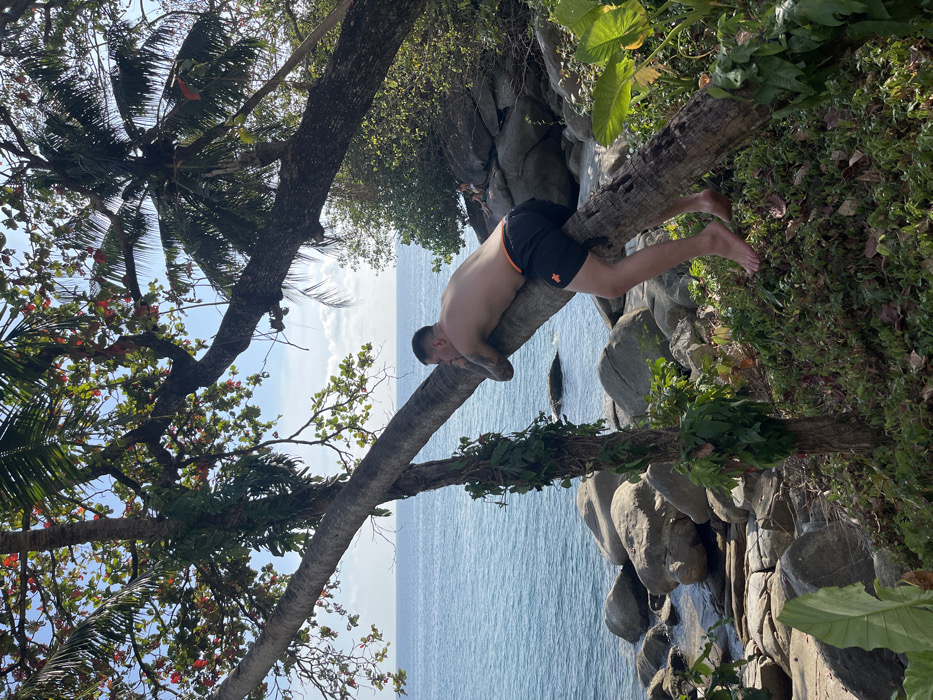 A man is depicted resting face down on a thick, diagonal tree trunk on a rocky coastline in Karon, Thailand