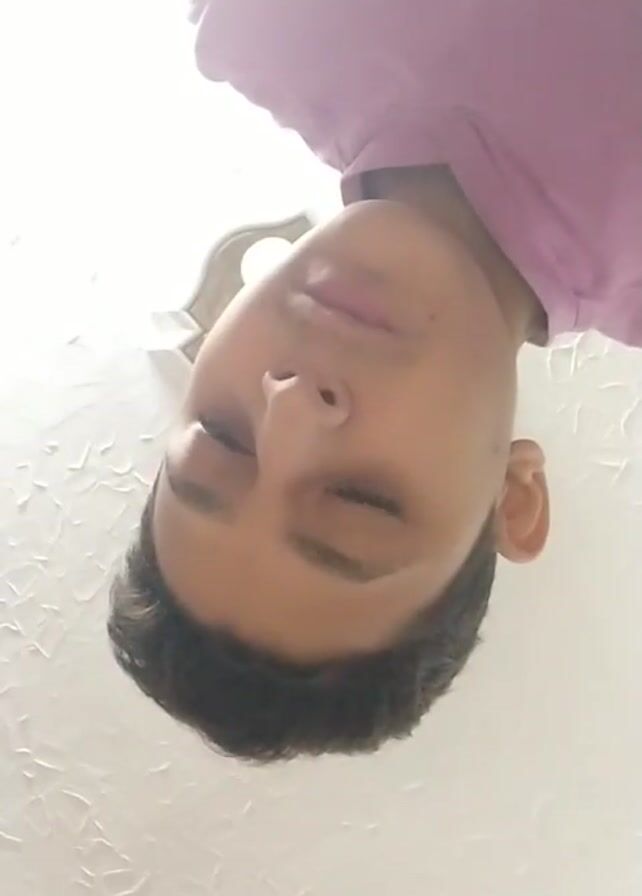 A person with short dark hair and a pink shirt is holding up a stack of $100 bills toward the camera. The person is looking at the camera and the background is a white ceiling with a textured design. The person flicks the bills rapidly.