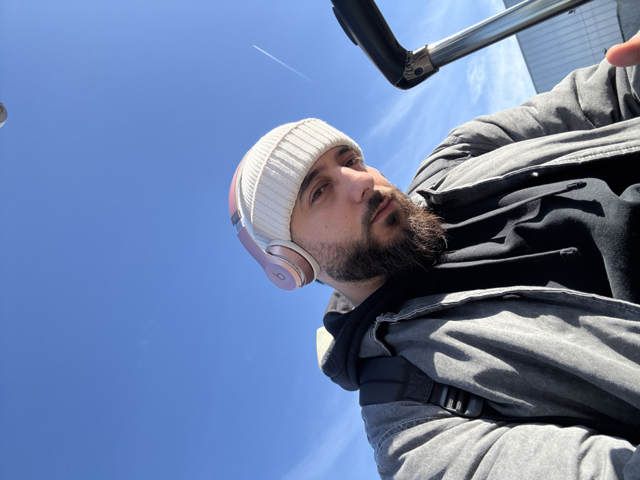 A male individual is depicted in a close-up outdoor portrait, presumably in Caen, France. He possesses a dark, full beard and dark hair, and is looking directly at the camera. He wears a light-colored knit beanie, topped with rose gold Beats brand headphones. His clothing includes a dark hooded sweatshirt underneath a faded grey button-up jacket. A black backpack strap is visible on his left shoulder. To the right, a chrome handle, consistent with an extendable luggage handle, is partially visible. The background consists of a clear, bright blue sky with a single faint aircraft contrail present in the upper right quadrant. The scene is illuminated by strong natural sunlight.