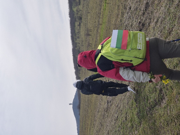 Three individuals are depicted walking on an unpaved, dry grassy field in the vicinity of Chargan, Bulgaria. The background features a prominent hill topped by a large, grey human-figure monument, specifically the Founders of the Bulgarian State Monument. The sky is uniformly overcast. In the foreground, an individual is viewed from behind, wearing a red hooded jacket with light grey sleeves and dark trousers. This person carries a lime-green backpack prominently displaying a Bulgarian flag and "ESB ENERGIE SÜDBAYERN" branding. A small bunch of yellow wildflowers is held in their right hand. Ahead and slightly to the left, a second individual, also viewed from behind, wears a dark puffer jacket, dark trousers with yellow accents, a white beanie, and white athletic shoes, carrying a dark backpack. A third person is partially visible behind the second. The ground is an uneven mixture of sparse green grass and bare earth. Leafless shrubs and bushes are visible on the right midground and along the distant hillside.