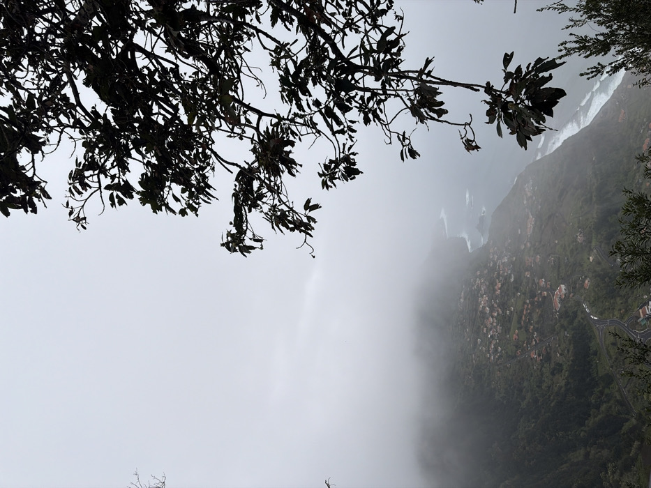 The image displays a high-angle panoramic view of a coastal landscape in the city of Santana, Portugal, under heavy fog and overcast conditions. A dark-silhouetted tree branch with dense foliage extends from the upper right corner into the frame. To the left and below, a small village is visible on a steep, verdant hillside. The village consists of numerous buildings, many featuring reddish-orange tiled roofs, interconnected by visible winding roads. The terrain slopes downwards towards the Atlantic Ocean, where white waves are actively crashing against a rocky coastline. Pervasive fog and low clouds obscure the upper portions of the hills and extend over the ocean, blending into the light grey, overcast sky and significantly limiting distant visibility. No individuals or specific actions beyond the ocean waves are discernible.