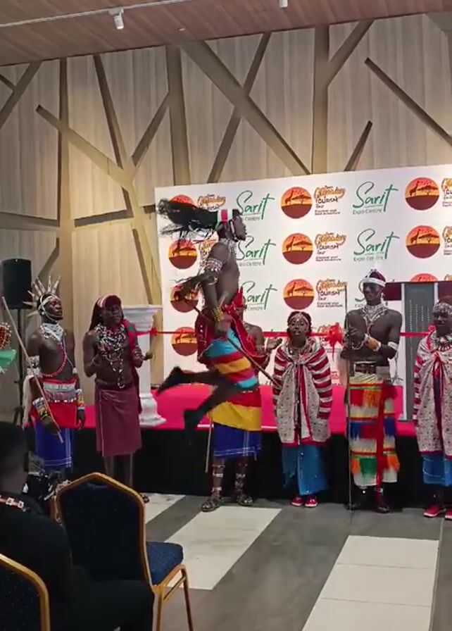 A group of eight people perform what appears to be a traditional Maasai dance in front of a backdrop of "Sarit Expo Centre" logos