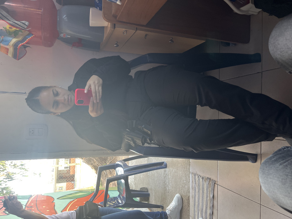 This image depicts an indoor setting in Quilmes Oeste, Argentina, with a doorway providing a view to an outdoor residential area during daylight. The central subject is a female, seated on a dark plastic chair, facing slightly left. She has dark hair, wears a black long-sleeved top and black trousers, and a black holster containing a firearm is visible on her right hip. She holds a bright pink smartphone in both hands, actively engaged with the device, looking down at its screen. To the left, partially visible, stands another individual wearing blue jeans, white sneakers, and a light-colored fanny pack, holding a dark smartphone. The immediate indoor floor is tiled. Against the right wall, a light-colored wooden dresser or cabinet holds a red and grey water dispenser with an inverted water bottle, a white mug, and a folded patterned cloth. A white electrical outlet is mounted on the wall to the subject's left. Through the doorway, an outdoor concrete surface is visible, along with another dark plastic chair. A wall adorned with orange and green mural elements is present on the left side of the outdoor view. Beyond this, residential buildings and some vegetation are visible in the background. The legs of a third individual, clad in light-colored jeans, occupy the immediate foreground, indicating the photographer's perspective.