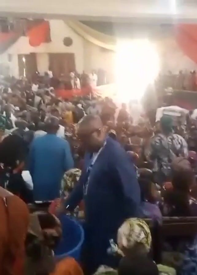 The video depicts a large crowd of people gathered in an indoor space, possibly a church or auditorium