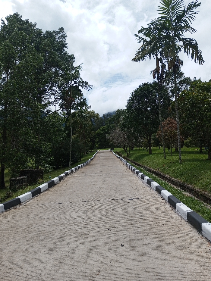 A straight, paved road leads into a lush green landscape under a cloudy sky. The road has black and white painted edges. Trees line the path on both sides, with taller palm trees interspersed among other foliage. The scene evokes a sense of tranquility and depth as the road recedes into the distance.