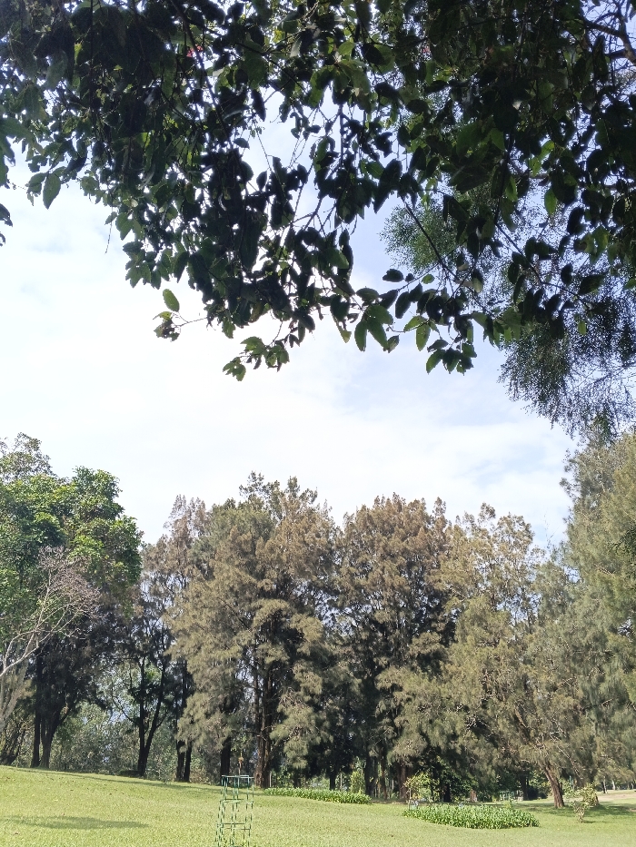 A vibrant green lawn slopes gently uphill, bordered by various trees. Pine trees with a brownish tint dominate the landscape. A canopy of lush green foliage frames the top of the image, providing shade and dappling the sky visible above. Bright blue sky with wisps of white clouds peek through the branches.