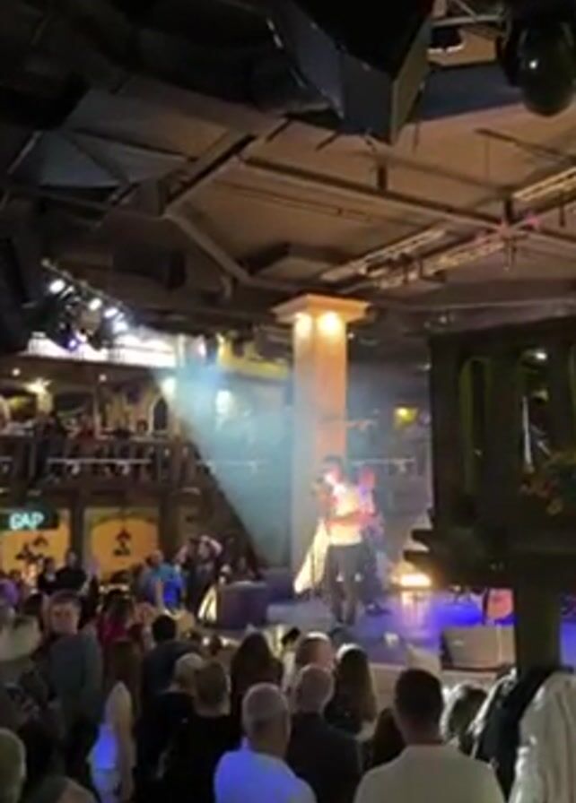 man singing on a stage in front of a crowd. He's wearing a white t-shirt with "1980" on it and black pants. He's holding a white shirt and gesturing with it. The stage is illuminated with bright lights and there are musical instruments in the background, including a piano. The audience is made up of people of different ages, most of whom are facing the stage. A bouquet of pink tulips is visible in the foreground. The venue appears to be a restaurant or club, with a balcony visible in the background with patrons.