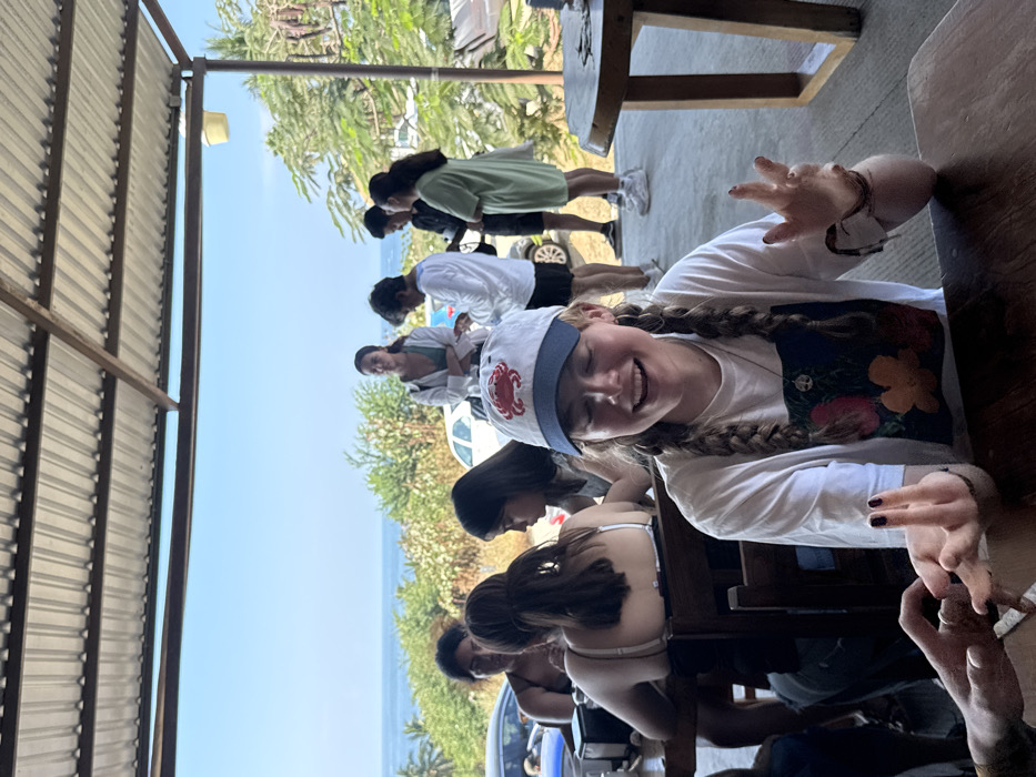 A group of people is outside on a sunny day. A young woman with braided hair and a crab hat smiles at the camera, making hand gestures. Behind her, other individuals are standing and sitting. In the background, there's a glimpse of the ocean and some vegetation. The photo seems to be taken from under a roof structure.