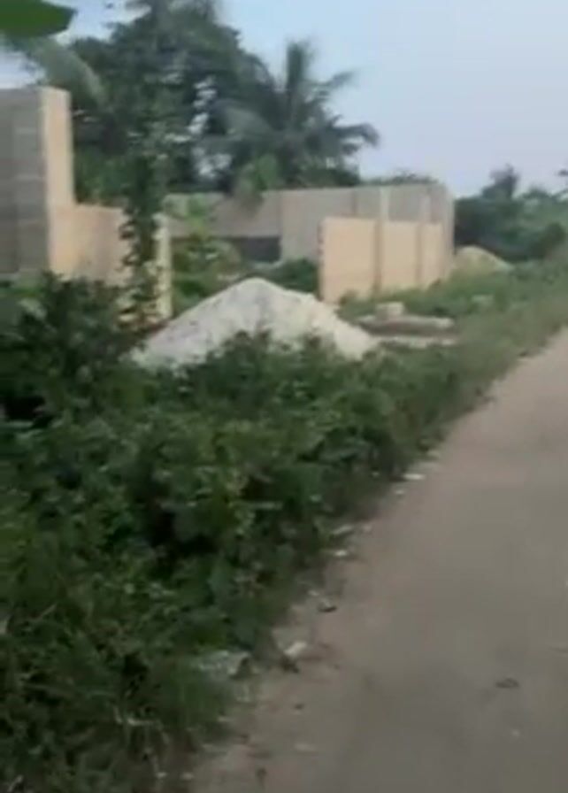 view of a dirt road leading away from the viewer. Along the left side of the road is a partially constructed building with block walls. A large pile of gravel sits next to the building, partially obscured by green vegetation. Palm trees and other greenery are visible in the background. The sky is overcast. The camera appears to be moving forward along the road.