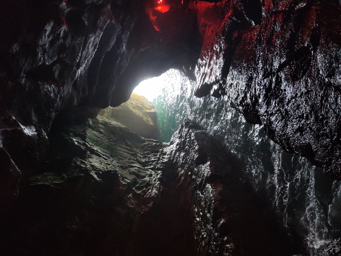 The image displays the interior of a natural sea grotto, identified as the Rosh HaNikra Grottoes, located in the Mate Asher Regional Council, Israel. The scene is predominantly dark, illuminated primarily by natural light entering from an opening at the far end. The foreground features dark, wet, and rugged rock formations. On the right, a prominent section of the grotto floor, composed of dark, glistening rock, extends towards the distant light source. This rock surface exhibits a subtle reddish reflection on its right side, suggesting an unseen artificial light source within the cave. To the left of this rocky path, a body of dark, turbulent water, appearing to be seawater, flows further into the grotto, with visible ripples and white foam. In the midground, the grotto narrows, with dark, damp rock walls rising on both sides. The turbulent water continues through this constricted passage. At the end of the grotto, a brightly lit opening reveals a body of lighter, turquoise-colored water and intense white light emanating from outside, indicating daylight. The grotto ceiling and upper walls are dark and rugged, with visible moisture and some lighter patches where water may be dripping or reflecting light. No individuals or clearly discernible man-made objects are visible within the frame.