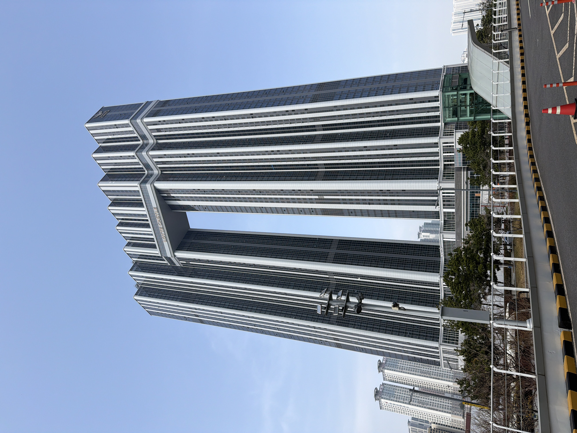 Haeundae LCT Landmark Tower in Busan, South Korea. The tall skyscraper, a prominent feature of the city's skyline, is distinguished by its split design and horizontal white stripes. The photo is taken from a low angle, emphasizing the height of the building against a clear blue sky. To the right of the building is a roadway with striped warning cones. Other buildings can be seen in the background, suggesting a dense urban environment.