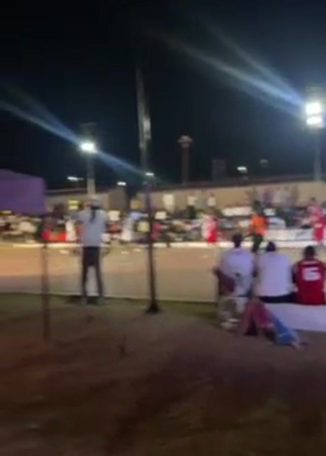The video captures an outdoor basketball game taking place at night. The court is illuminated by bright overhead lights. The game appears to be well-attended, with spectators seated on bleachers and standing along the sidelines. There are a number of players on the court wearing red jerseys, and another player in a white jersey. A tent is visible on one side of the court, with people gathered underneath, possibly scoring or officiating the game. Throughout the video, the camera perspective shifts, showing different angles of the court, the players, and the audience. The overall scene suggests a lively and engaging community event.