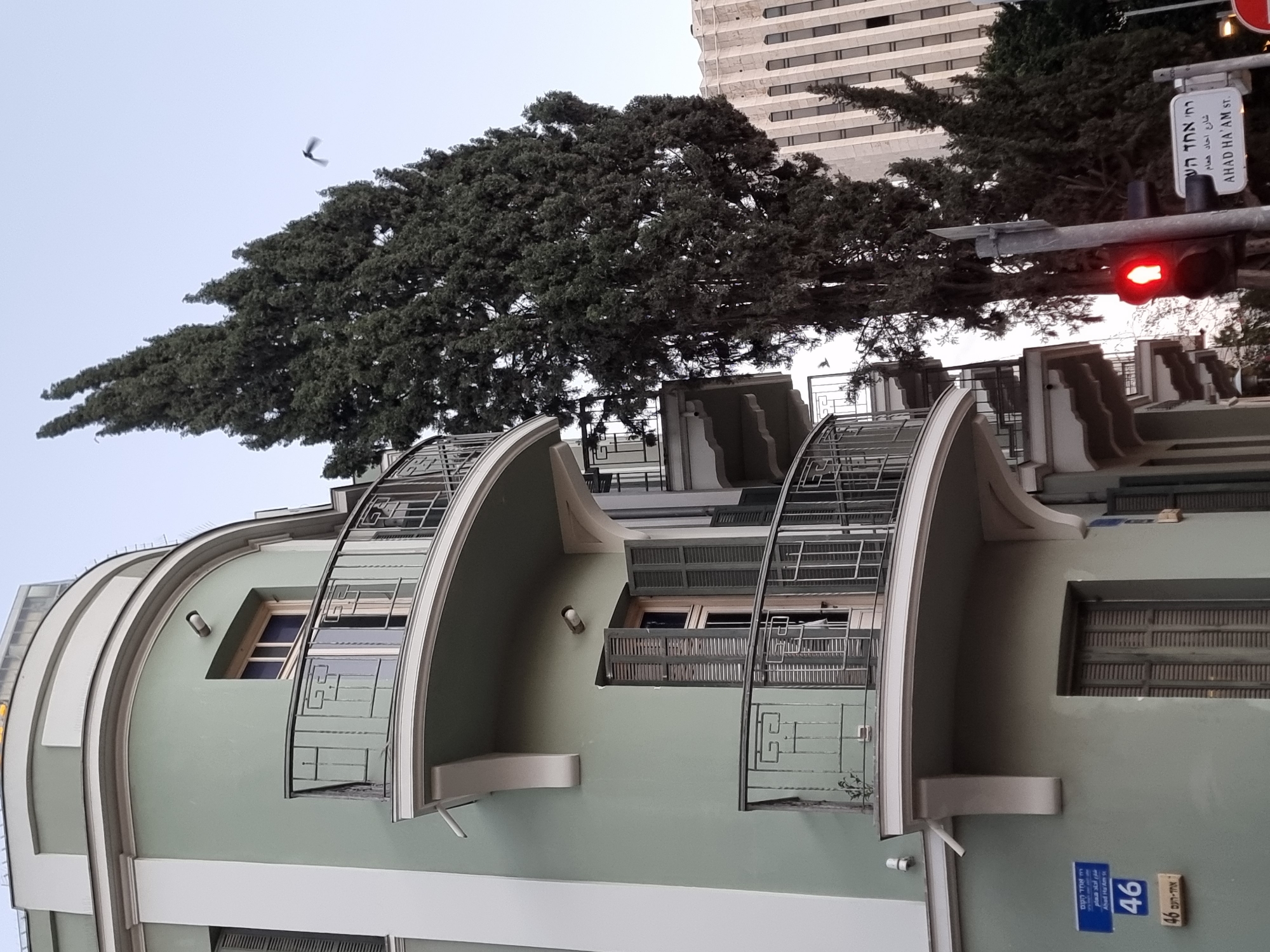 section of the Bauhaus architecture building, located in Tel-Aviv, Israel. A green building with architectural details is visible, including curved balconies and window designs. Street signs in Hebrew and English indicate the location as Ahad Ha'am Street. A street sign with the number 46 is visible. A traffic light is showing a red light. A large tree is present in the upper portion of the image, a bird is in flight overhead, and a tall building appears in the background. The image appears to be taken from a low-angle perspective.