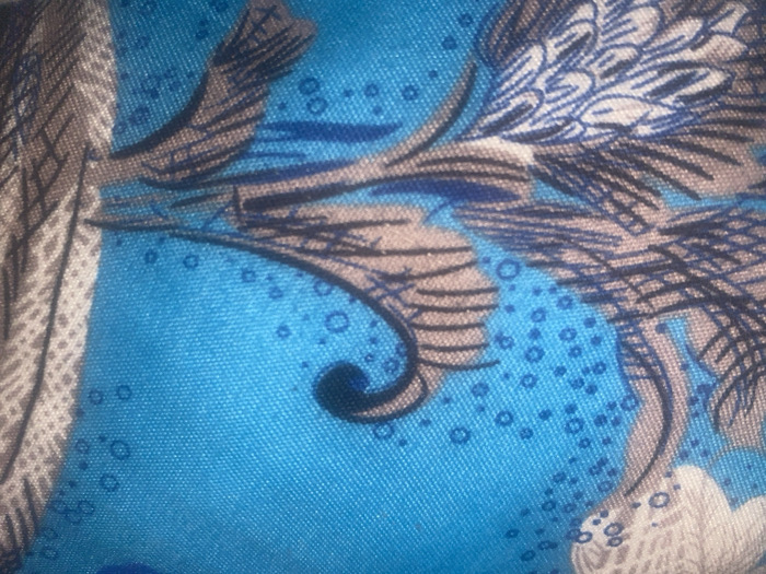 A close-up image shows a fabric with a teal background adorned with a stylized floral or feather-like pattern