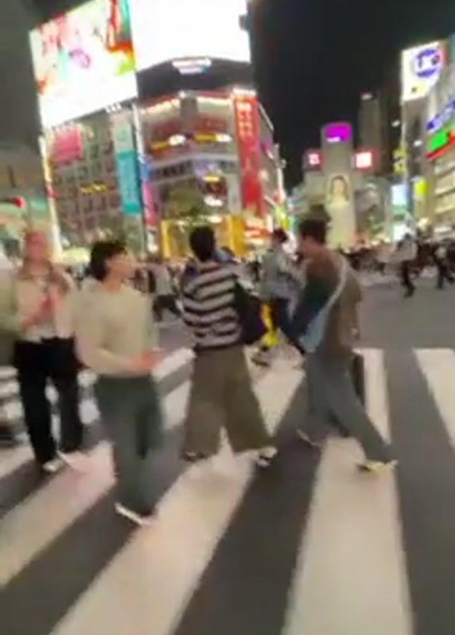 nighttime view of a crowded pedestrian crossing, likely in a major urban center in Japan given the signage. Numerous people of various ages and ethnicities are walking across the crosswalk, surrounded by brightly lit billboards and buildings. Most people are dressed casually. The camera appears to be handheld, moving along with the crowd as they navigate the intersection. The overall atmosphere is energetic and bustling.