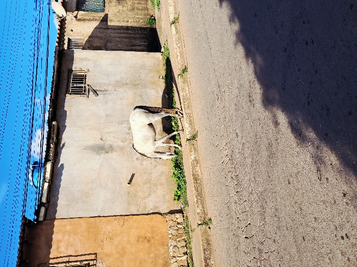 A white horse grazes on grass along a concrete sidewalk, next to an asphalt road with shadows. The area is near buildings with blue roofing and brown walls. A small window is visible on one building. The shot is taken from above, with a slight rotational skew.