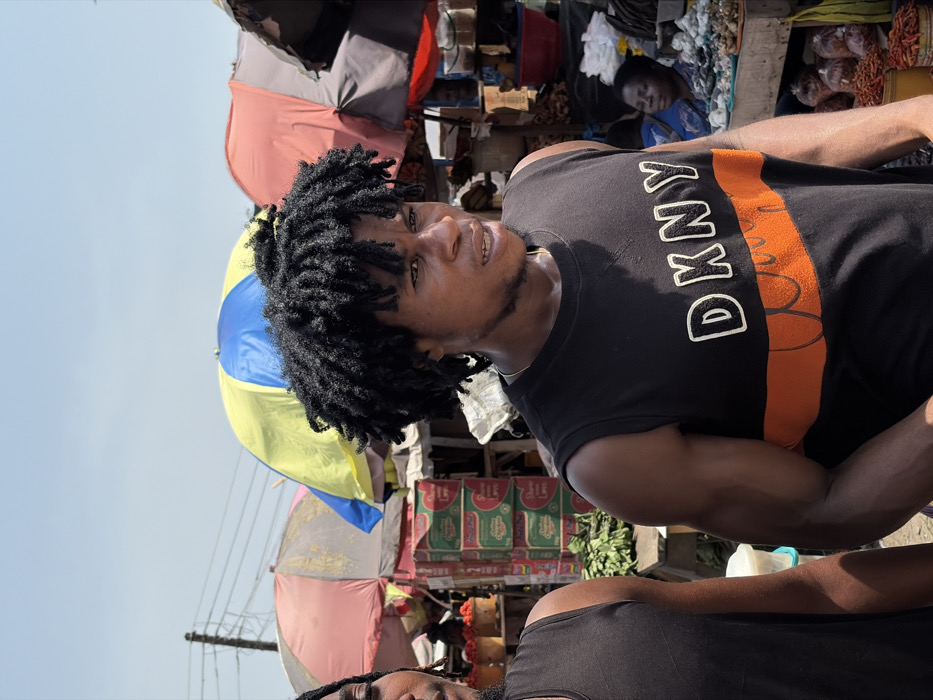 The image displays a young adult male with dark dreadlocks, wearing a black sleeveless shirt with "DKNY" printed in white and an orange stripe across the chest, standing in an outdoor market in Jakande, Nigeria