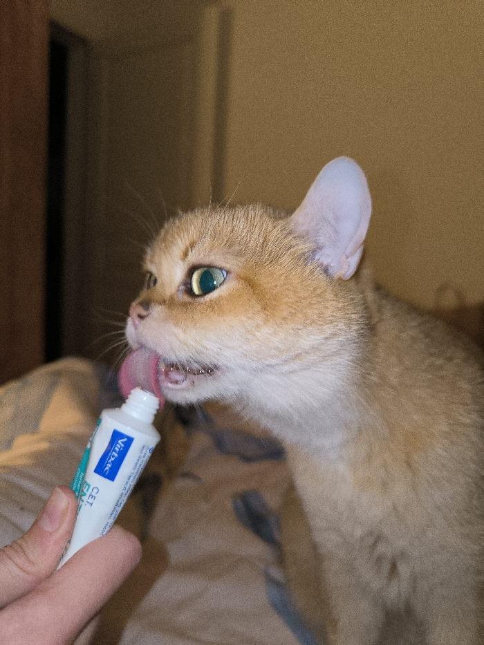- "A tan cat with green eyes is licking toothpaste from a white tube held by a human hand" by FM-ySTmw1, licensed under CC BY 4.0