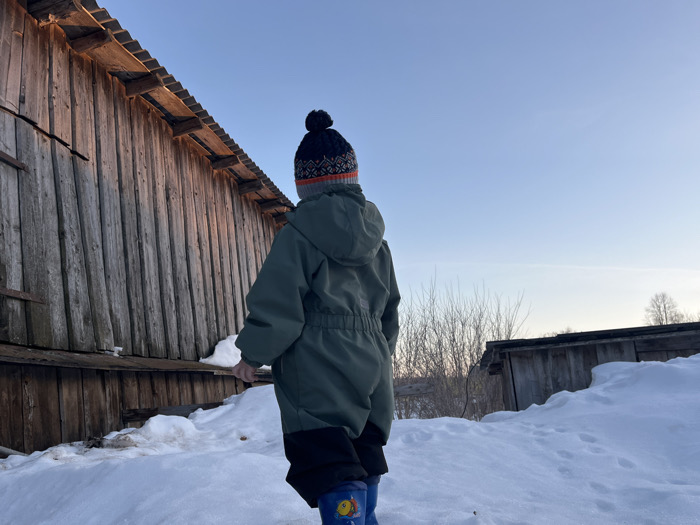 The image depicts a winter scene in Павловка, Russia. A young child, viewed from behind, stands in the foreground, facing towards the right. The child wears a dark blue knitted hat with a pom-pom and orange trim, a military green hooded winter jumpsuit with a black lower leg section, and blue boots with yellow details. The ground is covered in undisturbed white snow, with some visible boot prints to the right. To the left, a tall, weathered wooden building or wall constructed from vertical planks rises, its upper structure illuminated by warm, low-angle sunlight. In the midground on the right, another smaller, dark wooden structure is partially visible behind a snowdrift, with bare trees and brush appearing beyond it. The sky is clear and light blue, indicating fair weather.